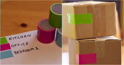 بالطبع عند تغليف الكرتونة يُصبح ما بداخلها مجهولاً، وعندما تقوم بإنزال الكراتين في بيتك الجديد قد تندهش عند فتحها بأن هذه الكرتونة كان يجب أن يتم تنزيلها في المطبخ بدلاً من غرفة المعيشة وهكذا. لذلك ضع شريطاً لاصقاً ملوناً يميز مكان إنزال كل كرتونة.