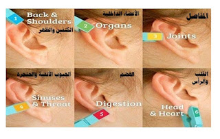 الجزء الأوسط الأعلى من الأذن يقابل المعصمين والكاحلين. ملقط الغسيل هو الحل لليدين والرجلين المتألمتين.