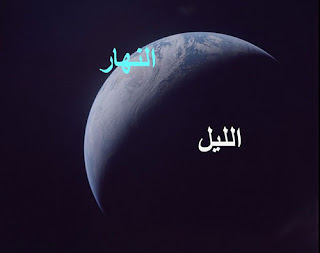 إن الذي ينظر إلى الأرض من الخارج يرى الظلام يغشى النهار على سطحها. بل إن الأرض محاطة بالكامل بالظلام. يقول تعالى: (يُغْشِي اللَّيْلَ النَّهَارَ يَطْلُبُهُ حَثِيثًا) [الأعراف: 54]. ولو أننا سرَّعنا حركة الأرض وصورناها بفيلم فيديو نرى وكأن الليل يلحق النهار ويحاول التقاطه ولكن دون أن يسبقه أو يتقدم عليه!