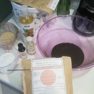 ول شي نخلط الكوفي و الملح و السكر و نمزجهم كويس و بعدين نصب زيت اللوز الحلو شوية شوية و نخلط في نفس الوقت ؛ لازم ننتبه ما نحط زيت كتير عشان ما تصير سائلة بس يادوب نبللها بالزيت . و آخر مرحلة نحط زيت الفيتامين e و زيت اليرتقال و نخلط .