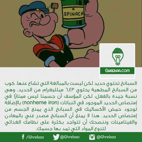 السبانخ تحتوي حديد لكن ليست بالمبالغة التي تشاع عنها. كوب من السبانخ المطهية يحتوي 6.43 ميلليغرام من الحديد، وهى نسبة جيدة بالفعل، لكن المؤسف أن جسمنا ليس ممتازًا في إمتصاص الحديد الموجود في النباتات (nonheme iron) بالإضافة لوجود حمض الأكساليك في السبانخ الذي يمنع الجسم من إمتصاص الحديد. هذا لا يمنع أن السبانخ مصدر غني بالمعادن والفيتامينات وننصحك أن تتواجد بكثرة على نظامك الغذائي لتنوع المواد التي تمد بها جسمك.